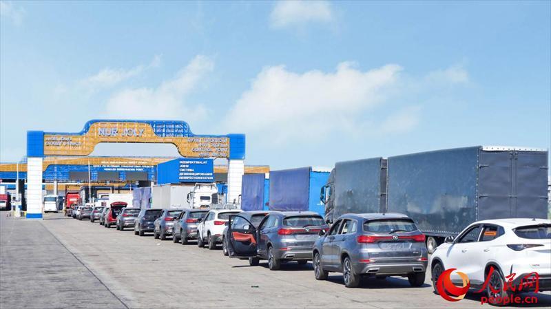 霍尔果斯公路口岸排队出境的车辆。人民网 李欣洋摄