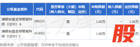 注:根据法律法规和基金合同的相关规定,浦银安盛基金管理有限公司(以下简称“本公司”或“基金管理人”)决定自2025年11月12日起,浦银安盛全球智能科技股票型证券投资基金(QDII)(以下简称“本基金”)单日单个基金账户累计申购(含申购、定期定额投资,A、C份额分别计算)金额限额调整为1万元人民币。如单日单个基金账号单笔申购(含申购、定期定额投资,A、C份额分别计算)本基金的金额超过1万元人民币,则1万元人民币确认成功,超过1万元人民币金额的部分确认失败;如单日单个基金账号多笔累计申购(含申购、定期定额投资,A、C份额分别计算)本基金的金额超过1万元人民币,基金管理人将对逐笔累加至符合不超过1万元人民币限额的申请确认成功,其余部分确认失败。