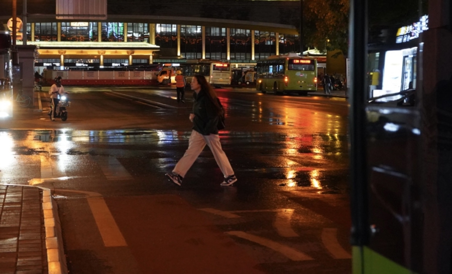夜晚在车站,仍有许多人等待公交接送。 冯蕊 摄