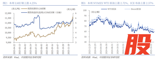 本周,COMEX黄金下跌0.64%,LME铜上涨4.25%,分别收于4197.60美元/盎司,11,645.00美元/吨,黄金与铜价形成显著的价格分化。本周美俄开展进一步会谈,市场未出现超预期的缓和和趋紧,黄金的避险价值难获溢价。近期LME铜交割订单激增创下2013年以来的单日增幅,其中中国台湾和韩国仓库的需求尤为强劲,直接推动了LME铜价近期突破历史新高。今年以来,供应问题持续主导着铜价走势,一方面,美国因潜在的关税政策,大量铜库存正持续转移至美国,加剧其他地区的现货短缺;另一方面,今年多处矿山停产已降低全球供应弹性,LME铜库存因此被消耗。中长期来看,铜价或将长期维持易涨难跌的基本面。本周,NYMEX WTI原油上涨2.72%,ICE布油上涨2.37%。市场预期为防范劳动力市场恶化,美联储将在下周会议降息利于提振经济增长,石油需求前景乐观。中长期,油价或面临下行压力,中枢或下移。