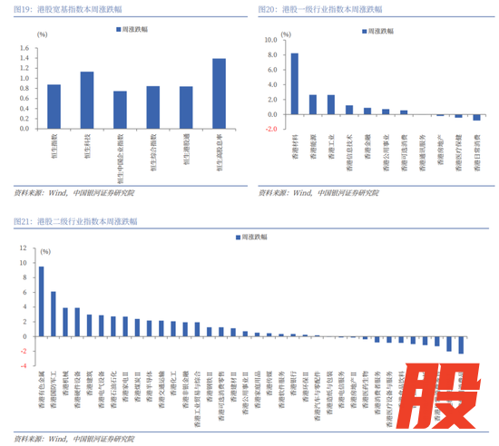 港股一级行业中,本周7个行业上涨,4个行业下跌。其中,材料、能源、工业行业指数涨幅居前,分别上涨8.23%、2.64%、2.62%;日常消费、医疗保健、房地产行业指数跌幅居前,分别下跌0.81%、0.44%、0.20%。港股二级行业中,有色金属、国防军工、机械、硬件设备、建筑行业指数涨幅居前,而耐用消费品、纺织服装、日常消费零售、房地产投资信托、企业服务行业指数跌幅居前。
