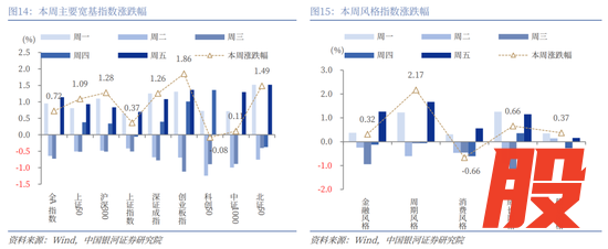 从风格来看,本周大盘风格相对占优,沪深300(1.28%)涨幅大于中证1000(0.11%);周期风格涨超2%,成长风格、稳定风格、金融风格也录得上涨,而消费风格震荡回调。