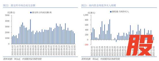 流动性指标方面,本周南向资金累计净流入113.49亿港元,较上周减少84.91亿港元。个股方面,截至12月5日的近7天,南向资金大幅净买入:小米集团-W(01810.HK)43.77亿港元;美团-W(03690.HK)28.96亿港元;阿里巴巴-W(09988.HK)23.41亿港元;泡泡玛特(09992.HK)10.81亿港元。大幅净卖出:腾讯控股(0700.HK)38.07亿港元;中芯国际(00981.HK)19.08亿港元。