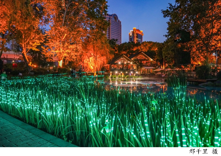 图为静安公园艺术家联名艺术装置《通感之林》灯光表演。