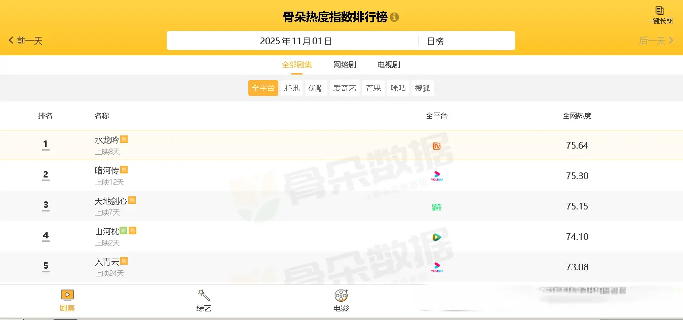 截止发文时间,从“骨朵热度指数排行榜”数据显示可知大资本,当前热播电视剧中,全网热度最高的五部剧分别如下: